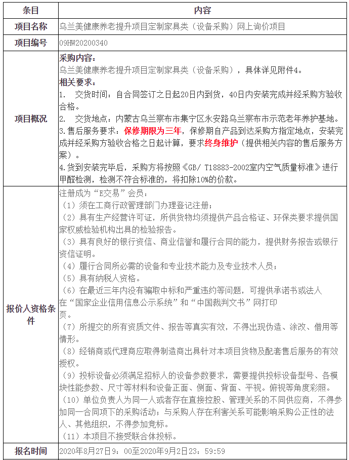 烏蘭美健康養(yǎng)老提升項目定制家具類(設備采購)網(wǎng)上詢價項目發(fā)布時間: 2020-08-27 -
